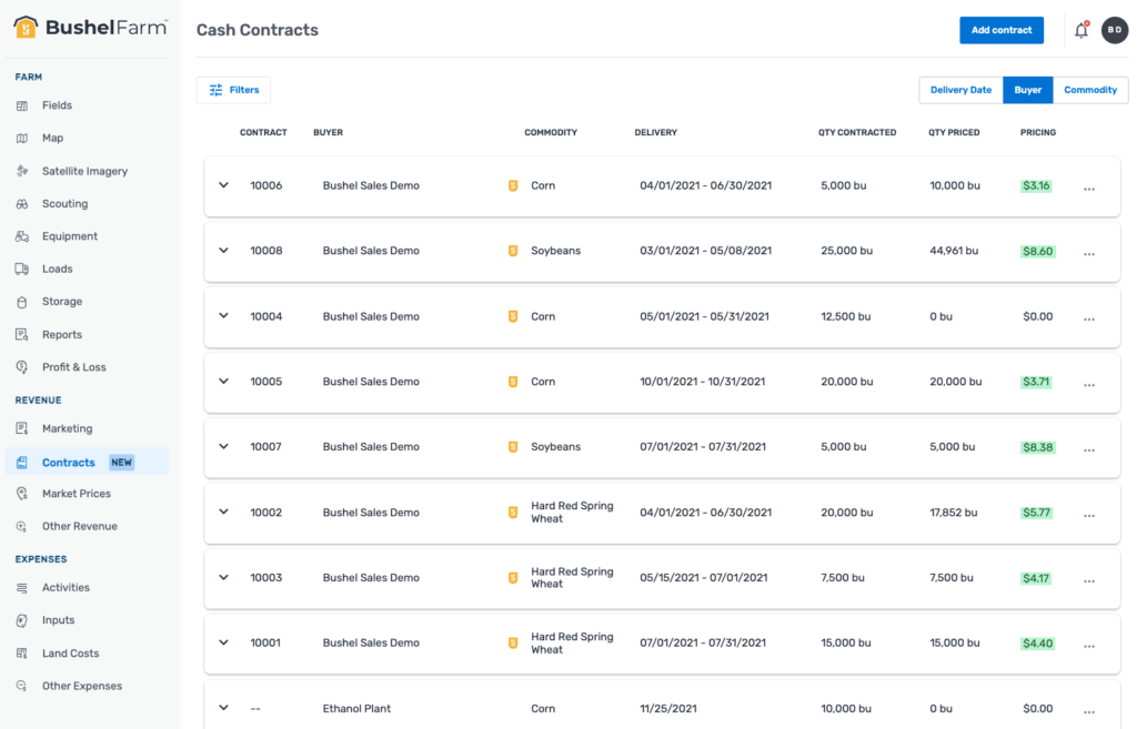 - If you’re doing business with grain buyers outside the Bushel Network, you can still manually enter those in the Contracts feature to keep track of all of your contracts in one place.