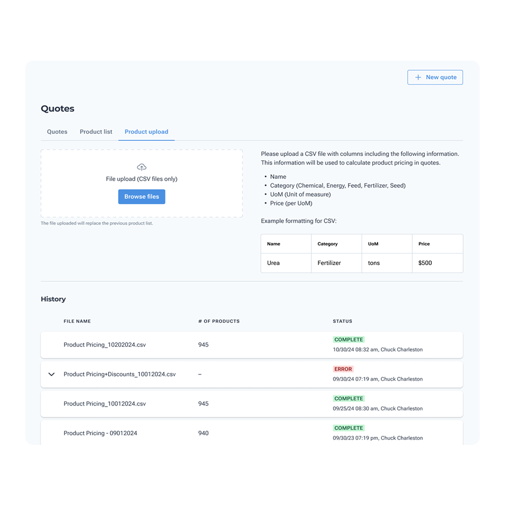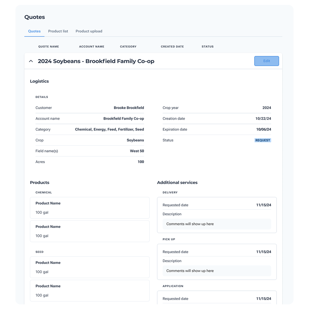Create, send, and track quotes—all in one place. Farmers can easily track and manage quotes in the portal they are already using, ensuring quick, informed decisions that support their farm’s needs.