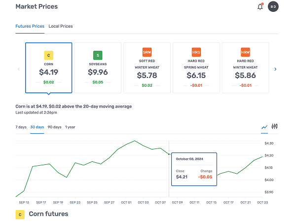 See current futures prices, and track price fluctuation and market carry to know if delivering your grain later is worth the wait.