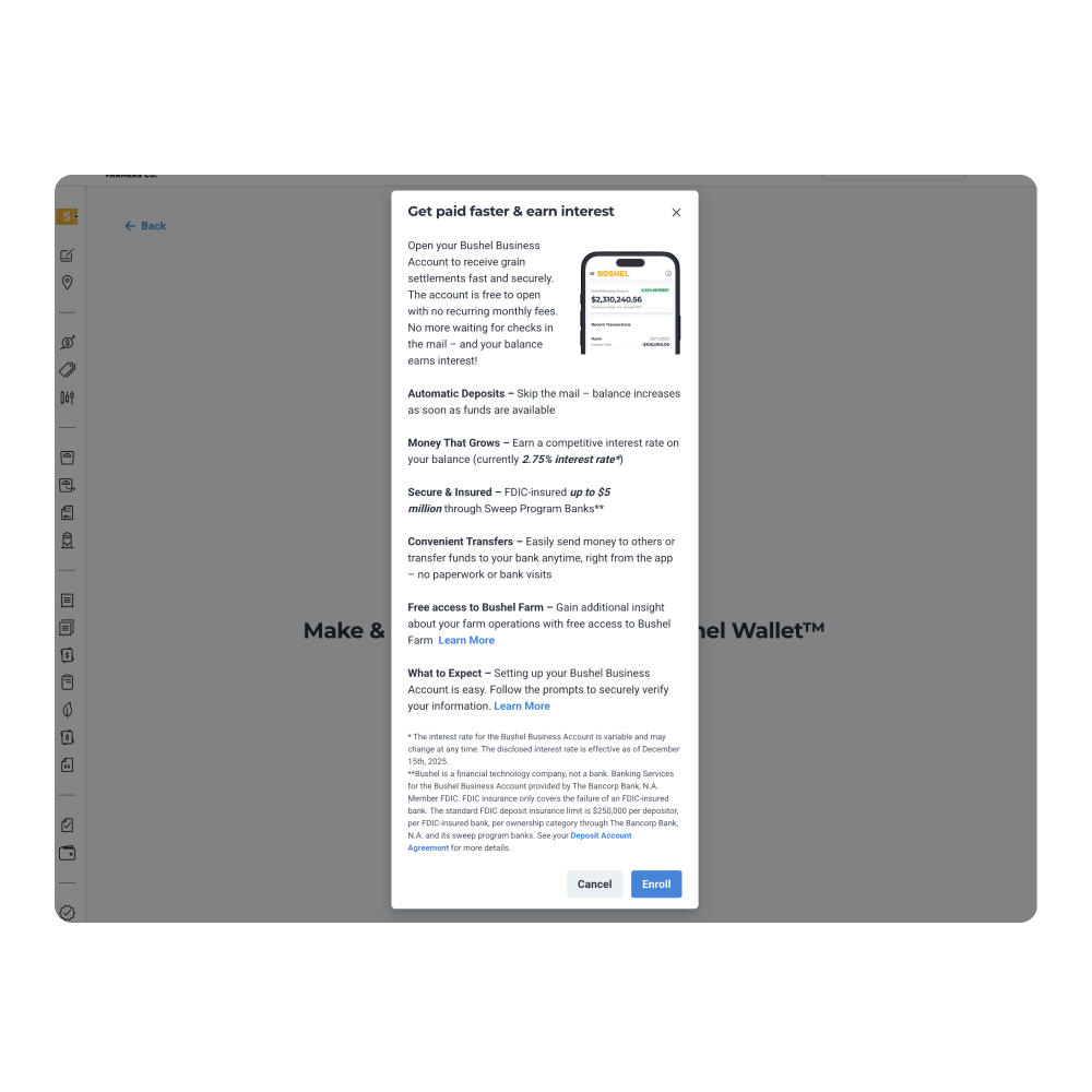 *The Bushel Farm plan is included for free when you open a Bushel Business Account or connect an existing Bushel Business Account in Bushel Farm. To view all features included for free click here. Cash back into a Bushel Business Account will occur at the time after an annual subscription fee is paid. If an annual subscription fee has already been paid in 2026 and a subscriber has opened a Bushel Business Account, Bushel will deposit cash back funds into the connected Bushel Business Account.