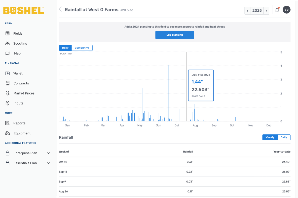 From tracking rainfall and field activities to managing cash flow, Bushel Farm helps simplify your day-to-day, giving you the tools to stay focused on what matters most—running your farm.