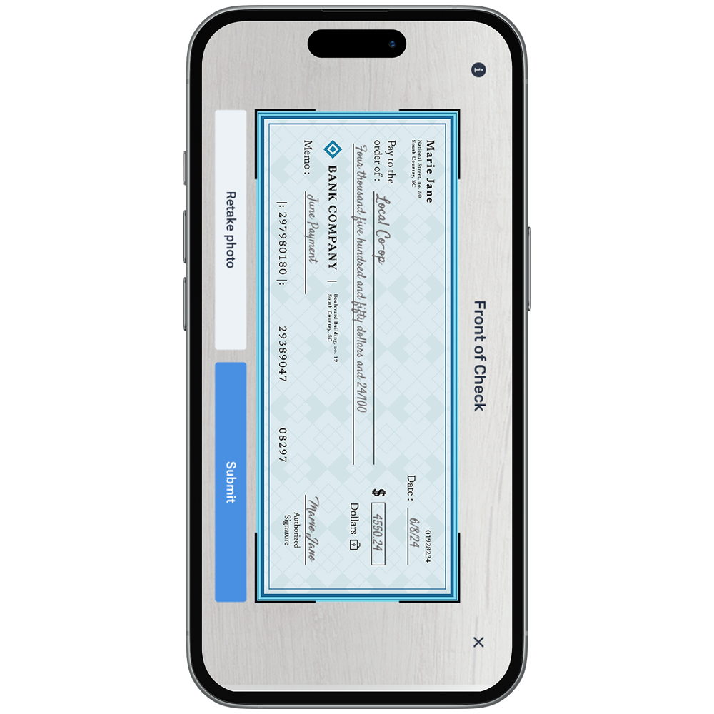Follow in app instructions to take photos of the front and back of the check.