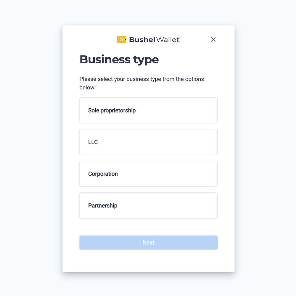 Follow the steps to open your Bushel Business Account, provided by The Bancorp Bank, N.A. Member FDIC.1 If you already have a Bushel Business Account, skip ahead to the next step.